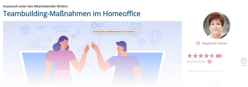 Teambuilding-Maßnahmen im Homeoffice Für das projektmagazin durfte ich einen Fachartikel schreiben: In diesem Tipp stellt Stephanie Selmer drei Maßnahmen vor, mit denen Sie das Teambuilding und den Wissensaustausch bei Ihren Mitarbeitenden im Homeoffice fördern. So kommt das Zwischenmenschliche in Zeiten von Remote Work nicht zu kurz! Hier kannst du den ganzen Artikel lesen: